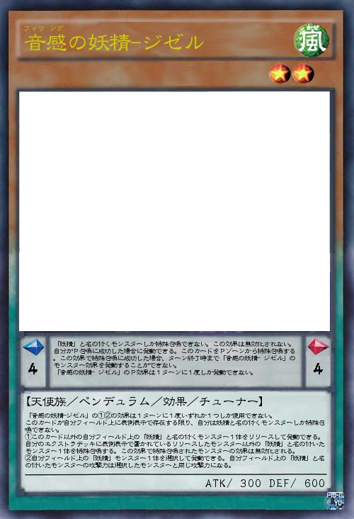 | 「妖精」と名の付くモンスターしか特殊召喚できない。この効果は無効化されない。 自分がP召喚に成功した場合に発動できる。このカードをPゾーンから特殊召喚する。この効果で特殊召喚に成功した場合、ターン終了時まで「音感の妖精-ジゼル」のモンスター効果を発動することができない。 「音感の妖精-ジゼル」のP効果は1ターンに1度しか発動できない。 | |||
