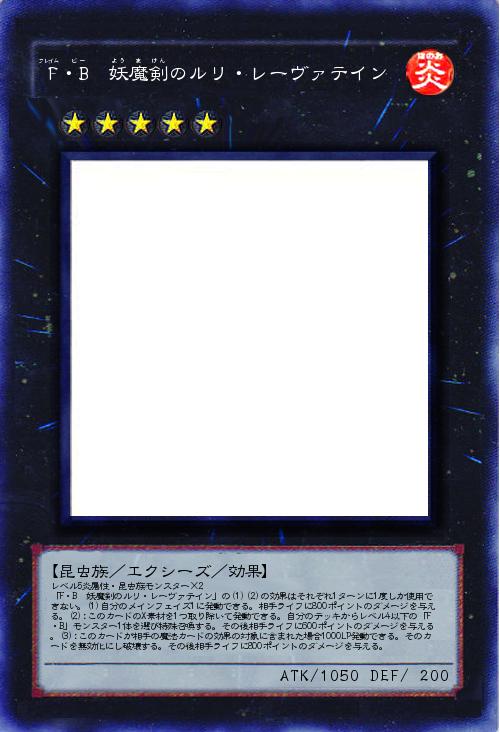 | レベル5炎属性・昆虫族モンスター×2 「F・B 妖魔剣のルリ・レーヴァテイン」の(1)(2)の効果はそれぞれ1ターンに1度しか使用できない。(1)自分のメインフェイズ1に発動できる。相手ライフに800ポイントのダメージを与える。(2):このカードのX素材を1つ取り除いて発動できる。自分のデッキからレベル4以下の「F・B」モンスター1体を選び特殊召喚する。その後相手ライフに600ポイントのダメージを与える。(3):このカードが相手の魔法カードの効果の対象に含まれた場合1000LP発動できる。そのカードを無効化にし破壊する。その後相手ライフに800ポイントのダメージを与える。 | |||