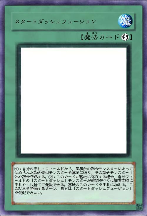 | ①:自分の手札・フィールドから、風属性の融合モンスターによって決められた融合素材モンスターを墓地に送り、その融合モンスター1体を融合召喚する。②:このカードが墓地に存在する場合、自分フィールドの「スタートダッシュ」モンスターが戦闘を行う攻撃宣言時に手札を1枚捨てて発動できる。墓地のこのカードを手札に加える。この効果を発動するターン、自分は「スタートダッシュフュージョン」を発動できない。 | |||