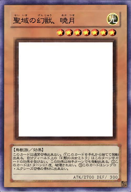 | このカードは通常召喚出来ない。①このカードを手札から捨てて発動出来る。自分フィールド上の「幻獣の巫女ミトラ」はこのターン中カードの効果を受けない。この効果は相手ターンでも発動出来る。②このカードは1ターンに1度、破壊されない。③このカードはシンクロ・エクシーズ召喚の素材に出来ない。 | |||
