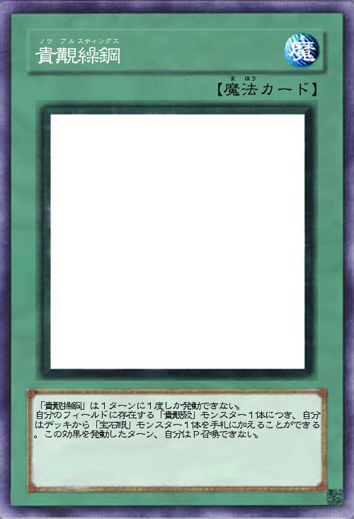 | 「貴覯操鋼」は1ターンに1度しか発動できない。 自分のフィールドに存在する「貴覯殻」モンスター1体につき、自分はデッキから「宝石眼」モンスター1体を手札に加えることができる。この効果を発動したターン、自分はP召喚できない。 | |||