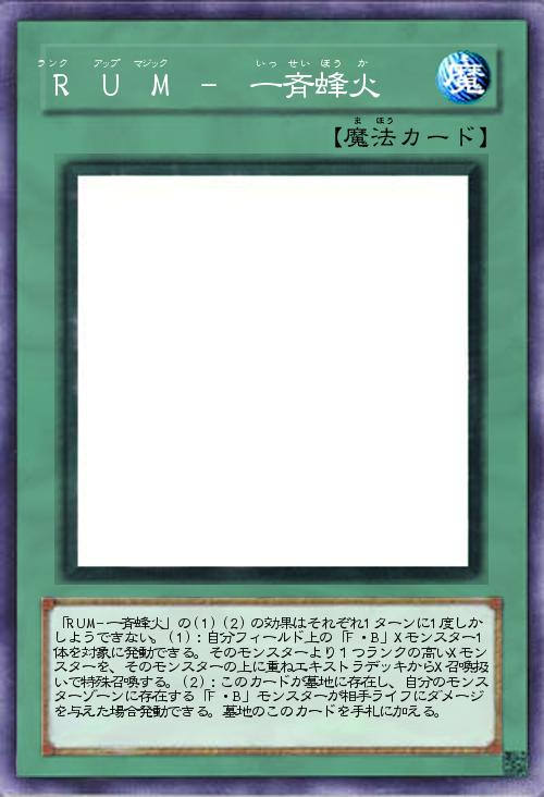 | 「RUM-一斉蜂火」の(1)(2)の効果はそれぞれ1ターンに1度しかしようできない。(1):自分フィールド上の「F・B」Xモンスター1体を対象に発動できる。そのモンスターより1つランクの高いXモンスターを、そのモンスターの上に重ねエキストラデッキからX召喚扱いで特殊召喚する。(2):このカードが墓地に存在し、自分のモンスターゾーンに存在する「F・B」モンスターが相手ライフにダメージを与えた場合発動できる。墓地のこのカードを手札に加える。 | |||