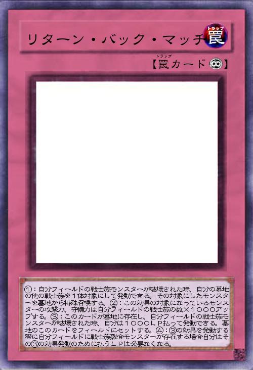 | ①:自分フィールドの戦士族モンスターが破壊された時、自分の墓地の他の戦士族を1体対象にして発動できる。その対象にしたモンスターを墓地から特殊召喚する。②:この効果の対象になっているモンスターの攻撃力、守備力は自分フィールドの戦士族の数×1000アップする。③:このカードが墓地に存在し、自分フィールドの戦士族モンスターが破壊された時、自分は1000LP払って発動できる。墓地のこのカードをフィールドにセットする。④:③の効果を発動する際に自分フィールドに戦士族融合モンスターが存在する場合自分はその③の効果発動のために払うLPは必要なくなる。 | |||