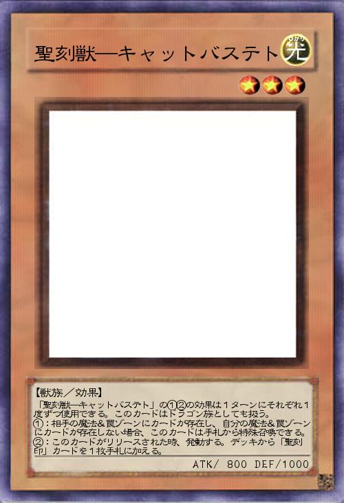 | 「聖刻獣―キャットバステト」の①②の効果は1ターンにそれぞれ1度ずつ使用できる。このカードはドラゴン族としても扱う。 ①:相手の魔法&罠ゾーンにカードが存在し、自分の魔法&罠ゾーンにカードが存在しない場合、このカードは手札から特殊召喚できる。 ②:このカードがリリースされた時、発動する。デッキから「聖刻 印」カードを1枚手札に加える。 | |||
