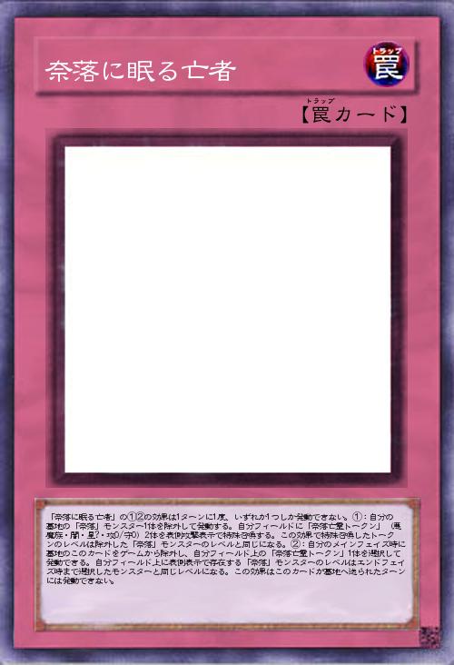 | 「奈落に眠る亡者」の①②の効果は1ターンに1度、いずれか1つしか発動できない。①:自分の墓地の「奈落」モンスター1体を除外して発動する。自分フィールドに「奈落亡霊トークン」(悪魔族・闇・星?・攻0/守0)2体を表側攻撃表示で特殊召喚する。この効果で特殊召喚したトークンのレベルは除外した「奈落」モンスターのレベルと同じになる。②:自分のメインフェイズ時に墓地のこのカードをゲームから除外し、自分フィールド上の「奈落亡霊トークン」1体を選択して発動できる。自分フィールド上に表側表示で存在する「奈落」モンスターのレベルはエンドフェイズ時まで選択したモンスターと同じレベルになる。この効果はこのカードが墓地へ送られたターンには発動できない。 | |||