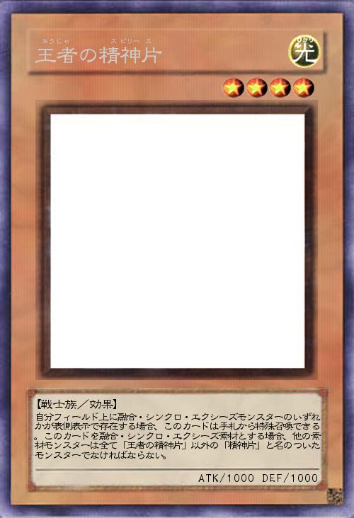| 自分フィールド上に融合・シンクロ・エクシーズモンスターのいずれかが表側表示で存在する場合、このカードは手札から特殊召喚できる。このカードを融合・シンクロ・エクシーズ素材とする場合、他の素材モンスターは全て「王者の精神片」以外の「精神片」と名のついたモンスターでなければならない。 | |||