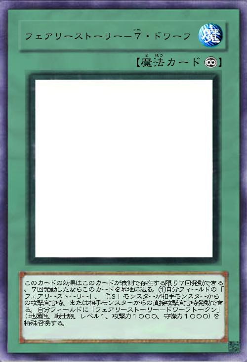 | このカードの効果はこのカードが表側で存在する限り7回発動できる。7回発動したならこのカードを墓地に送る。①自分フィールドの「フェアリーストーリー」、「ES」モンスターが相手モンスターからの攻撃宣言時、または相手モンスターからの直接攻撃宣言時発動できる。自分フィールドに「フェアリーストーリー-ドワーフトークン」(地属性、戦士族、レベル1、攻撃力1000、守備力1000)を特殊召喚する。 | |||