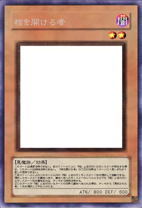 | このカードは通常召喚できない。自分フィールド上に「棺」と名の付いたモンスターが存在する場合、このカードは特殊召喚できない。「棺を開ける者」の①②の効果は1ターンに1度いずれか1度しか使用できない。 ①自分フィールド上のこのカード以外の「棺」と名の付くモンスター1体を選択して発動できる。選択したモンスターを墓地へ送り、墓地へ送ったモンスターのレベル+3以下の「棺」と名の付いたモンスター1体を墓地または、デッキから特殊召喚する。 ②このカードが「棺」と名の付いたカードの効果で墓地へ送られた場合、デッキから「憑依された者」1枚を選択して手札に加える。 | |||