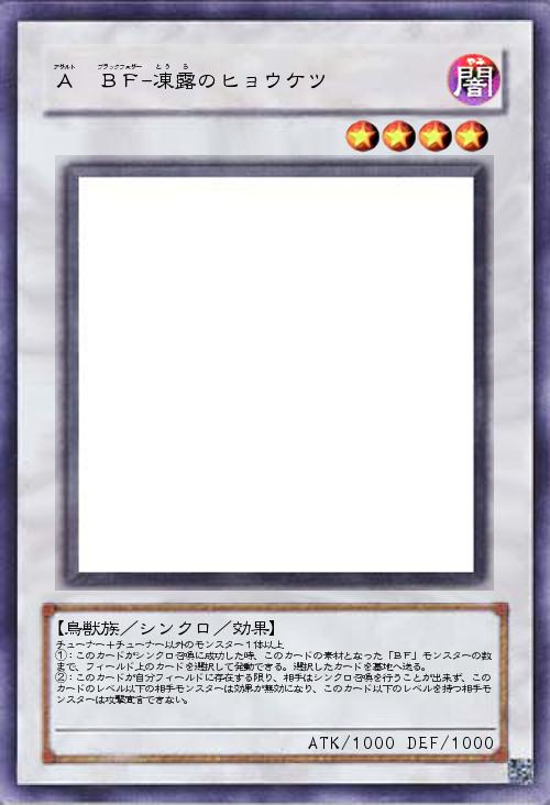 | チューナー+チューナー以外のモンスター1体以上 ①:このカードがシンクロ召喚に成功した時、このカードの素材となった「BF」モンスターの数まで、フィールド上のカードを選択して発動できる。選択したカードを墓地へ送る。 ②:このカードが自分フィールドに存在する限り、相手はシンクロ召喚を行うことが出来ず、このカードのレベル以下の相手モンスターは効果が無効になり、このカード以下のレベルを持つ相手モンスターは攻撃宣言できない。 | |||