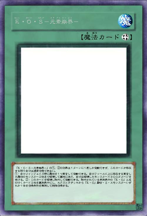 | 「E・O・S-元素崩界-」の①、②の効果は1ターンに1度しか発動できず、このカードが存在する限り自分は通常召喚できない。 ①:自分メインフェイズ時に属性を1つ宣言して発動できる。自分フィールド上に存在する宣言した属性のモンスター2体まで破壊して墓地に送り、自分は破壊したモンスター×300ダメージを受ける。②:このカードを破壊し除外して発動できる。除外されている表側表示の「E・O」と名の付くカード2枚を裏側表示にし、エクストラデッキから「E・O」融合・S・Xモンスターいずれか1体を召喚条件を無視して特殊召喚する。 | |||