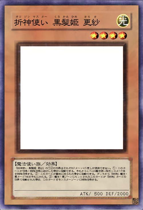 | 「折神使い 黒髪姫 更紗」の①②の効果はそれぞれ1ターンに1度しか使用できない。①:このカードが召喚・特殊召喚に成功した場合に発動できる。手札からレベル4魔法使い族モンスター1体を特殊召喚する。②:このカードが墓地に送られた場合に発動できる。デッキから「折神」魔法・罠カード1枚を手札に加える。③:魔法・罠ゾーンにセットされたこのカードが「折神」カードの効果で発動された場合、このカードをモンスターゾーンに特殊召喚する。 | |||
