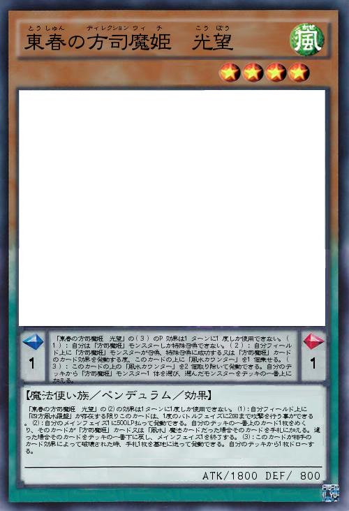 | 「東春の方司魔姫 光望」の(2)の効果は1ターンに1度しか使用できない。(1):自分フィールド上に「四方風水羅盤」が存在する限りこのカードは、1度のバトルフェイズに2回まで攻撃を行う事ができる。(2):自分のメインフェイズ1に500LP払って発動できる。自分のデッキの一番上のカード1枚をめくり、そのカードが「方司魔姫」カード又は「風水」魔法カードだった場合そのカードを手札に加える。違った場合そのカードをデッキの一番下に戻し、メインフェイズ1を終了する。(3):このカードが相手のカード効果によって破壊された時、手札1枚を墓地に送って発動できる。自分のデッキから1枚ドローする。 | |||