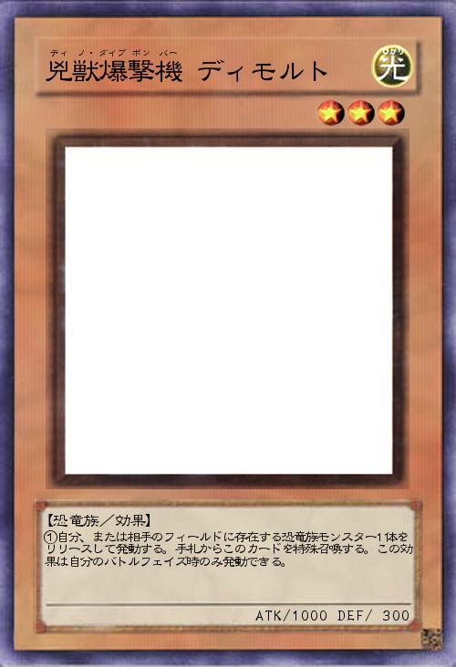 | ①自分、または相手のフィールドに存在する恐竜族モンスター1体をリリースして発動する。手札からこのカードを特殊召喚する。この効果は自分のバトルフェイズ時のみ発動できる。 | |||
