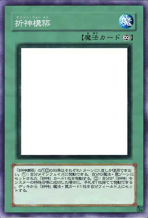 | 「折神構築」の①②の効果はそれぞれ1ターンに1度しか使用できない。①:自分メインフェイズに発動できる。自分の魔法・罠ゾーンにセットされた「折神」カード1枚を発動する。②:自分が「折神」モンスターの特殊召喚に成功した場合に、手札を1枚捨てて発動できる。デッキから「折神」魔法・罠カード1枚を自分フィールド上にセットする。 | |||