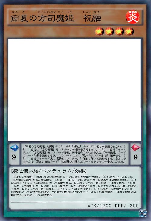 | 「南夏の方司魔姫 祝融」の(2)の効果は1ターンに1度しか使用できない。(1):自分フィールド上に「四方風水羅盤」が存在する限り、このカードは1ターンに1度までカード効果では破壊されない。(2):自分のメインフェイズ1に500LP払って発動できる。自分のデッキの一番上のカード1枚を捲り、そのカードが「方司魔姫」カード又は「風水」魔法カードだった場合そのカードを手札に加える。違った場合、そのカードをデッキの一番下に戻し、メインフェイズ1を終了する。(3):このカードが相手モンスターの攻撃によって破壊された場合、手札1枚を墓地に送り相手フィールド上の魔法罠カード1枚を対象に発動できる。そのカードを破壊する。 | |||