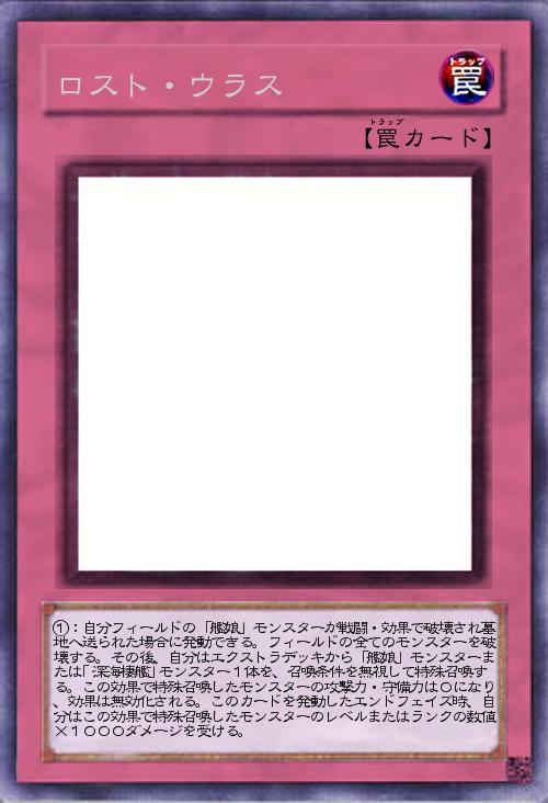 | ①:自分フィールドの「艦娘」モンスターが戦闘・効果で破壊され墓地へ送られた場合に発動できる。フィールドの全てのモンスターを破壊する。その後、自分はエクストラデッキから「艦娘」モンスターまたは「深海棲艦」モンスター1体を、召喚条件を無視して特殊召喚する。この効果で特殊召喚したモンスターの攻撃力・守備力は0になり、効果は無効化される。このカードを発動したエンドフェイズ時、自分はこの効果で特殊召喚したモンスターのレベルまたはランクの数値×1000ダメージを受ける。 | |||