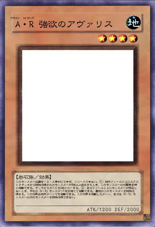 | このモンスターは融合・S・X素材にできず、リリースできない。①:相手フィールド上にエクストラデッキから特殊召喚されたモンスターが3体以上存在するとき、このモンスターの攻撃宣言時に発動できる。デッキからカードを2枚ドローする。②:自分フィールド上にモンスターが存在しないとき、手札の「A・R」モンスター1枚を捨てて発動できる。墓地のこのモンスターを特殊召喚する。この効果は相手ターンでも発動できる。この効果を発動したターン、自分は「A・R」モンスター以外のモンスターを特殊召喚できない。 | |||
