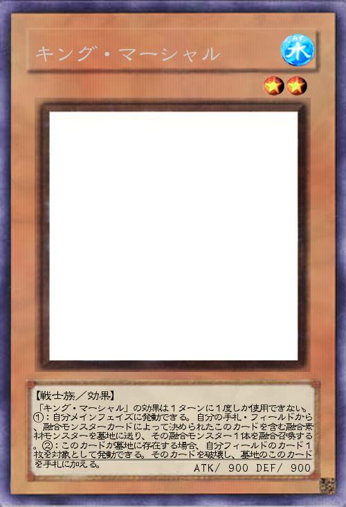| 「キング・マーシャル」の効果は1ターンに1度しか使用できない。①:自分メインフェイズに発動できる。自分の手札・フィールドから、融合モンスターカードによって決められたこのカードを含む融合素材モンスターを墓地に送り、その融合モンスター1体を融合召喚する。②:このカードが墓地に存在する場合、自分フィールドのカード1枚を対象として発動できる。そのカードを破壊し、墓地のこのカードを手札に加える。 | |||
