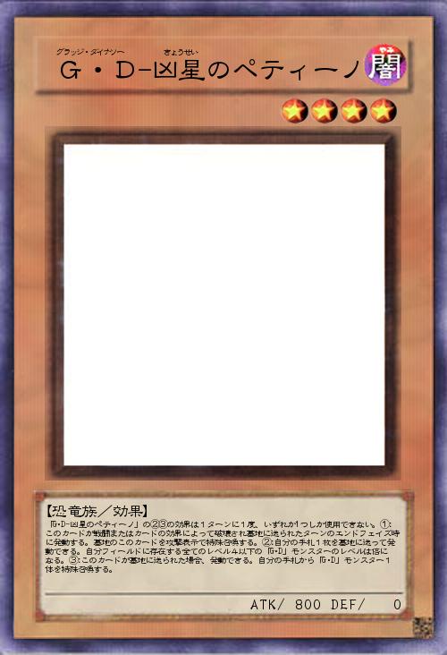 | 「G・D-凶星のペティーノ」の②③の効果は1ターンに1度、いずれか1つしか使用できない。①:このカードが戦闘またはカードの効果によって破壊され墓地に送られたターンのエンドフェイズ時に発動する。墓地のこのカードを攻撃表示で特殊召喚する。②:自分の手札1枚を墓地に送って発動できる。自分フィールドに存在する全てのレベル4以下の「G・D」モンスターのレベルは倍になる。③:このカードが墓地に送られた場合、発動できる。自分の手札から「G・D」モンスター1体を特殊召喚する。 | |||