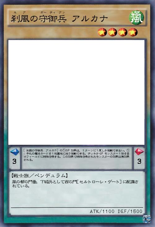 | [刹風の守御兵 アルカナ]の①のP効果は、1ターンに1度しか発動できない。①:手札の魔法カードを1枚墓地に送り発動できる。デッキからPモンスター1体を自分フィールドに特殊召喚する。この効果で特殊召喚されたモンスターの効果は無効果される。 | |||