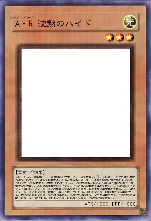 | このモンスターは融合・S・X素材にできず、リリースできない。①:このカードを手札から墓地へ送り、相手フィールド上に表側表示で存在するエクストラデッキから特殊召喚されたモンスター1体を選択して発動する。選択した相手モンスターの効果はエンドフェイズ時まで無効になり、攻撃宣言できない。この効果は相手のメインフェイズ時のみ発動する事ができる。②:自分のメインフェイズ時に、フィールド上に表側表示で存在するこのカードを手札に戻す事ができる。③:自分フィールド上にモンスターが存在しないとき、手札の「A・R」モンスター1枚を捨てて発動できる。墓地のこのモンスターを特殊召喚する。この効果は相手ターンでも発動できる。この効果を発動したターン、自分は「A・R」モンスター以外のモンスターを特殊召喚できない。 | |||