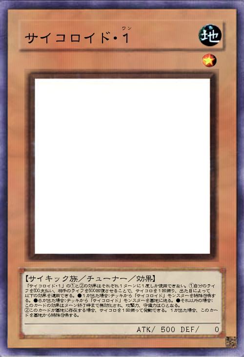 | 「サイコロイド・1」の①と②の効果はそれぞれ1ターンに1度しか使用できない。①自分のライフを500支払い、相手のライフを500回復させることで、サイコロを1回振り、出た目によって以下の効果を適用できる。●1が出た場合:デッキから「サイコロイド」モンスターを特殊召喚する。●6が出た場合:デッキから「サイコロイド」モンスターを墓地に送る。●それ以外の場合:このカードの効果はターン終了時まで無効化され、攻撃力、守備力は0となる。 ②このカードが墓地に存在する場合、サイコロを1回振って発動できる。1が出た場合、このカードを墓地から特殊召喚する。 | |||