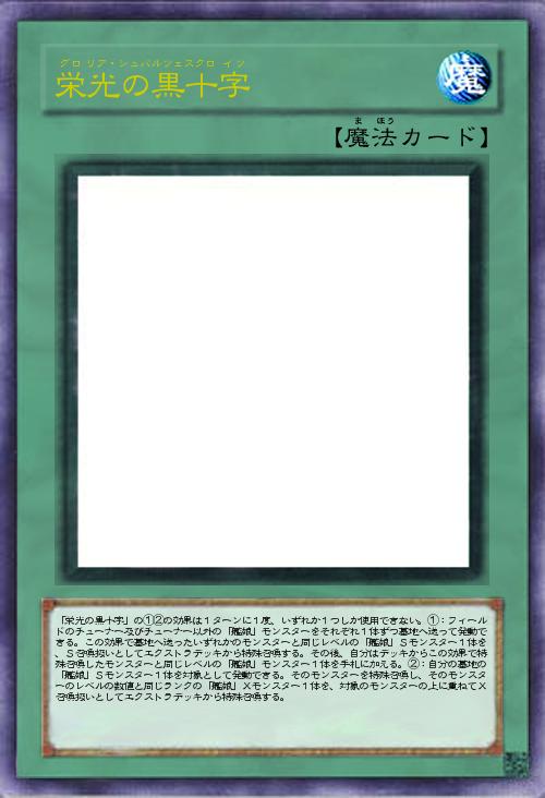 | 「栄光の黒十字」の①②の効果は1ターンに1度、いずれか1つしか使用できない。①:フィールドのチューナー及びチューナー以外の「艦娘」モンスターをそれぞれ1体ずつ墓地へ送って発動できる。この効果で墓地へ送ったいずれかのモンスターと同じレベルの「艦娘」Sモンスター1体を、S召喚扱いとしてエクストラデッキから特殊召喚する。その後、自分はデッキからこの効果で特殊召喚したモンスターと同じレベルの「艦娘」モンスター1体を手札に加える。②:自分の墓地の「艦娘」Sモンスター1体を対象として発動できる。そのモンスターを特殊召喚し、そのモンスターのレベルの数値と同じランクの「艦娘」Xモンスター1体を、対象のモンスターの上に重ねてX召喚扱いとしてエクストラデッキから特殊召喚する。 | |||