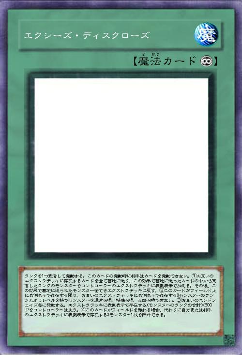 | ランクを1つ宣言して発動する。このカードの発動時に相手はカードを発動できない。①お互いのエクストラデッキに存在するカードを全て墓地に送り、この効果で墓地に送ったカードの中から宣言したランクのモンスターをコントローラーのエクストラデッキに表側表示で加える。その後、この効果で墓地に送られたモンスター全てをエクストラデッキに戻す。②このカードがフィールド上に表側表示で存在する限り、お互いのエクストラデッキに表側表示で存在するXモンスターのランクと同じレベルを持つモンスターを通常召喚、特殊召喚、反転召喚できない。③お互いのエンドフェイズ毎に発動する。エクストラデッキに表側表示で存在するXモンスターのランクの合計×800LPをコントローラーは失う。④このカードがフィールドを離れる場合、代わりに自分または相手のエクストラデッキに表側表示で存在するXモンスター1枚を除外できる。 | |||