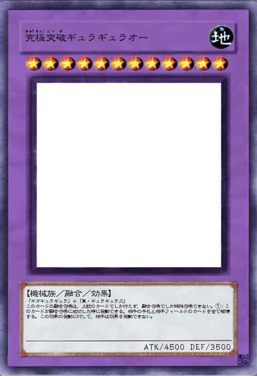 | 「ギガギュラギュラ」+「真・ギュラギュラズ」 このカードの融合召喚は、上記のカードでしか行えず、融合召喚でしか特殊召喚できない。①:このカードが融合召喚に成功した時に発動できる。相手の手札と相手フィールドのカードを全て破壊する。この効果の発動に対して、相手は効果を発動できない。 | |||