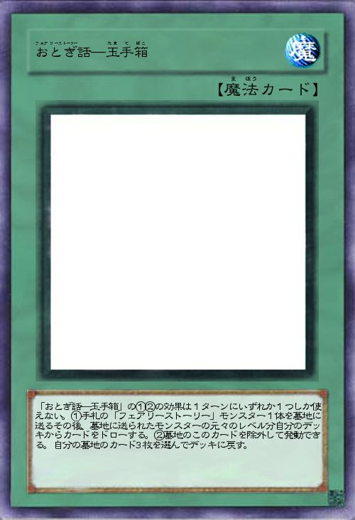 | 「おとぎ話―玉手箱」の①②の効果は1ターンにいずれか1つしか使えない。①手札の「フェアリーストーリー」モンスター1体を墓地に送るその後、墓地に送られたモンスターの元々のレベル分自分のデッキからカードをドローする。②墓地のこのカードを除外して発動できる。自分の墓地のカード3枚を選んでデッキに戻す。 | |||