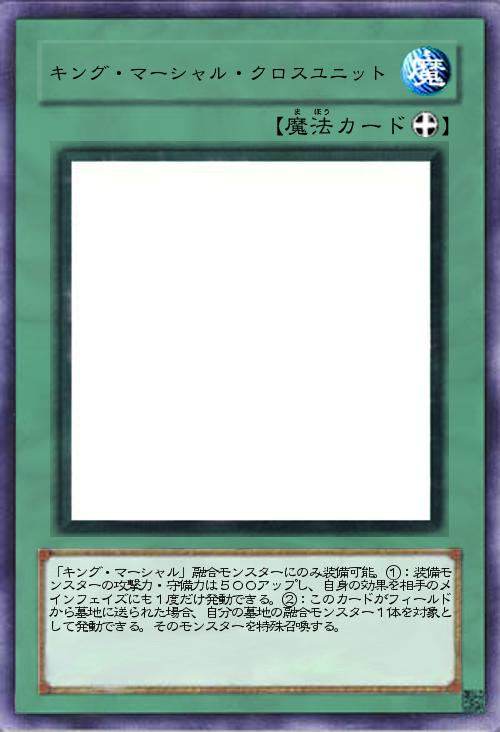 | 「キング・マーシャル」融合モンスターにのみ装備可能。①:装備モンスターの攻撃力・守備力は500アップし、自身の効果を相手のメインフェイズにも1度だけ発動できる。②:このカードがフィールドから墓地に送られた場合、自分の墓地の融合モンスター1体を対象として発動できる。そのモンスターを特殊召喚する。 | |||