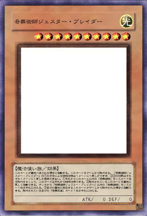 | このカードが墓地へ送られる場合に発動する。このカードをゲームから除外する。「奇葬術師ジェスター・ブレイダー」の①の方法による特殊召喚は1ターンに1度しかできず、②③の効果はそれぞれ1ターンに1度しか使用できない。①手札からこのカード以外の「奇葬術師」モンスター1体を除外することで、このカードは手札から特殊召喚できる。②除外されているこのカードを墓地に戻して発動できる。デッキから「奇葬術師ジェスター・ブレイダー」以外の「奇葬術師」モンスター1体を手札に加える。③自分の墓地に存在するこのカードがゲームから除外された場合に発動できる。除外されている自分の「奇葬仮面」カード1枚を手札に加える。 | |||