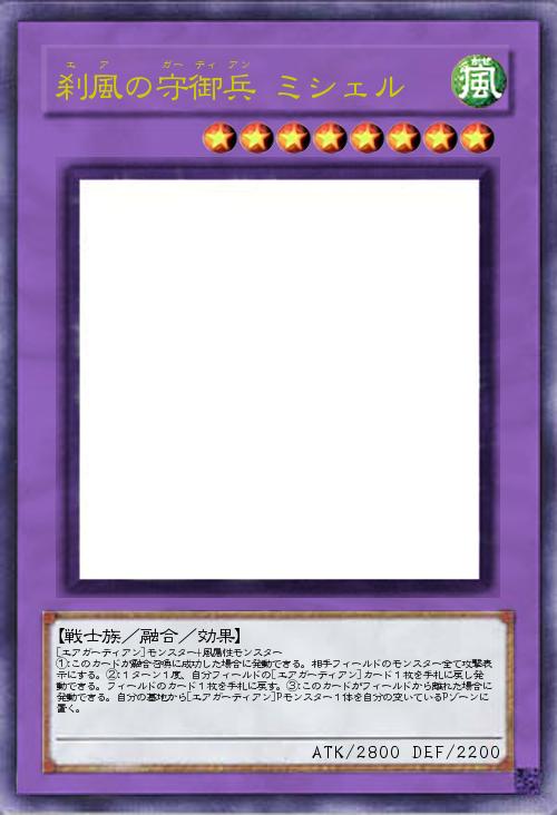 | [エアガーディアン]モンスター+風属性モンスター ①:このカードが融合召喚に成功した場合に発動できる。相手フィールドのモンスター全て攻撃表示にする。②:1ターン1度、自分フィールドの[エアガーディアン]カード1枚を手札に戻し発動できる。フィールドのカード1枚を手札に戻す。③:このカードがフィールドから離れた場合に発動できる。自分の墓地から[エアガーディアン]Pモンスター1体を自分の空いているPゾーンに置く。 | |||