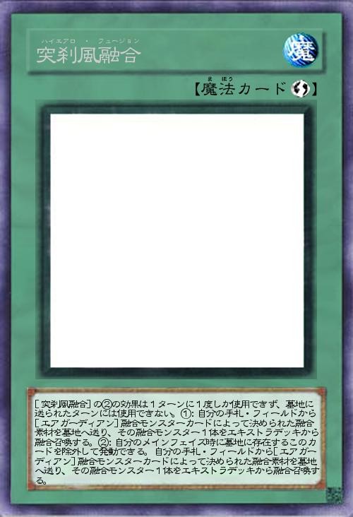 | [突刹風融合]の②の効果は1ターンに1度しか使用できず、墓地に送られたターンには使用できない。①:自分の手札・フィールドから[エアガーディアン]融合モンスターカードによって決められた融合素材を墓地へ送り、その融合モンスター1体をエキストラデッキから融合召喚する。②:自分のメインフェイズ時に墓地に存在するこのカードを除外して発動できる。自分の手札・フィールドから[エアガーディアン]融合モンスターカードによって決められた融合素材を墓地へ送り、その融合モンスター1体をエキストラデッキから融合召喚する。 | |||