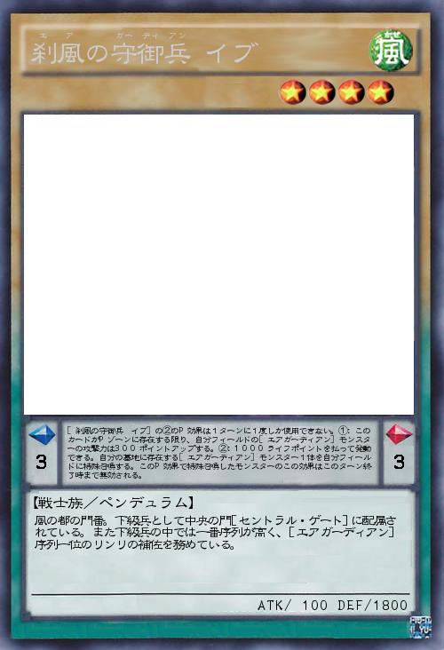 | [刹風の守御兵 イブ]の②のP効果は1ターンに1度しか使用できない。①:このカードがPゾーンに存在する限り、自分フィールドの[エアガーディアン]モンスターの攻撃力は300ポイントアップする。②:1000ライフポイントを払って発動できる。自分の墓地に存在する[エアガーディアン]モンスター1体を自分フィールドに特殊召喚する。このP効果で特殊召喚したモンスターのこの効果はこのターン終了時まで無効される。 | |||