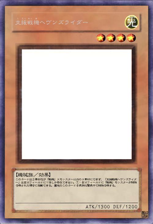 | このカードはS素材及び「戦機」Xモンスター以外のX素材にできず、「支援戦機ヘヴンズライダー」は自分フィールドに1体しか存在できない。①:自分フィールドに「戦機」モンスターが特殊召喚された場合に発動できる。墓地のこのカードを表側攻撃表示で特殊召喚する。 | |||