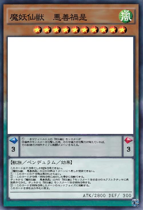 | このカードはP召喚でしか特殊召喚できない。 「魔妖仙獣 悪善禍是」の②の効果は1ターンに1度しか使用できない。 ① :このカードのP召喚は無効化されない。 ② :このカードが召喚・特殊召喚に成功した場合に発動できる。 デッキから「魔妖仙獣 悪善禍是」以外の「妖仙獣」Pモンスター1体を自分のエクストラデッキに表側表示で加え、デッキから「妖仙獣」モンスター1体を特殊召喚する。 ③ :このカードを特殊召喚したターンのエンドフェイズに発動する。 このカードを持ち主の手札に戻す。 | |||