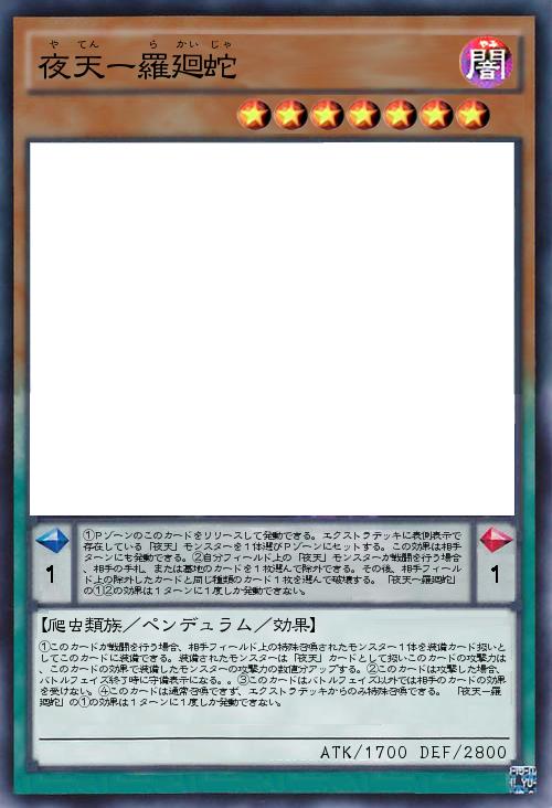 | ①Pゾーンのこのカードをリリースして発動できる。エクストラデッキに表側表示で存在している「夜天」モンスターを1体選びPゾーンにセットする。この効果は相手ターンにも発動できる。②自分フィールド上の「夜天」モンスターが戦闘を行う場合、相手の手札、または墓地のカードを1枚選んで除外できる。その後、相手フィールド上の除外したカードと同じ種類のカード1枚を選んで破壊する。「夜天ー羅廻蛇」の①②の効果は1ターンに1度しか発動できない。 | |||