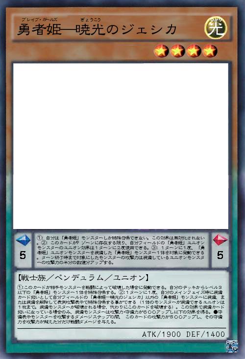 | ①:このカードが相手モンスターを戦闘によって破壊した場合に発動できる。自分のデッキからレベル3以下の「勇者姫」モンスター1体を特殊召喚する。②:1ターンに1度、自分のメインフェイズ時に装備カード扱いとして自分フィールドの「勇者姫―暁光のジェシカ」以外の「勇者姫」モンスターに装備、または装備を解除して表側攻撃表示で特殊召喚する事ができる(1体のモンスターが装備できるユニオンは1枚まで。装備モンスターが破壊される場合、代わりにこのカードを破壊する)。この効果で装備カード扱いになっている場合のみ、装備モンスターは攻撃力・守備力が600アップし以下の効果を得る。●守備表示モンスターを攻撃するダメージステップの間、 このカードの攻撃力が500アップし、その守備力を攻撃力が超えた分だけ戦闘ダメージを与える。 | |||