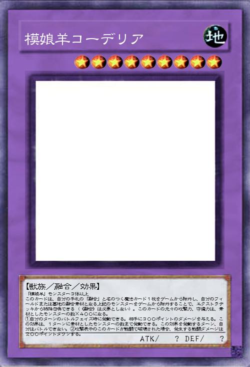 | 「模娘羊」モンスター3体以上 このカードは、自分の手札の「融合」と名のつく魔法カード1枚をゲームから除外し、自分のフィールドまたは墓地の融合素材となる上記のモンスターをゲームから除外することで、エクストラデッキから特殊召喚できる(《融合》は必要としない)。このカードの元々の攻撃力、守備力は、素材としたモンスターの数×400になる。 ①自分のターンのバトルフェイズ時に発動できる。相手に300ポイントのダメージを与える。この効果は、1ターンに素材としたモンスターの数まで発動できる。この効果を発動するターン、自分はバトルできない。②攻撃表示のこのカードが戦闘で破壊された場合、発生する戦闘ダメージは200ポイントダウンする。 | |||