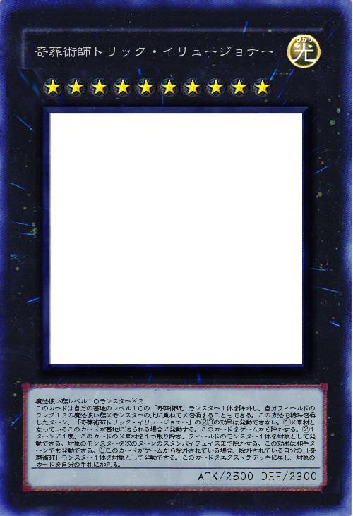| 魔法使い族レベル10モンスター×2 このカードは自分の墓地のレベル10の「奇葬術師」モンスター1体を除外し、自分フィールドのランク12の魔法使い族Xモンスターの上に重ねてX召喚することもできる。この方法で特殊召喚したターン、「奇葬術師トリック・イリュージョナー」の②③の効果は発動できない。①X素材となっているこのカードが墓地に送られる場合に発動する。このカードをゲームから除外する。②1ターンに1度、このカードのX素材を1つ取り除き、フィールドのモンスター1体を対象として発動できる。対象のモンスターを次のターンのスタンバイフェイズまで除外する。この効果は相手ターンでも発動できる。③このカードがゲームから除外されている場合、除外されている自分の「奇葬術師」モンスター1体を対象として発動できる。このカードをエクストラデッキに戻し、対象のカードを自分の手札に加える。 | |||