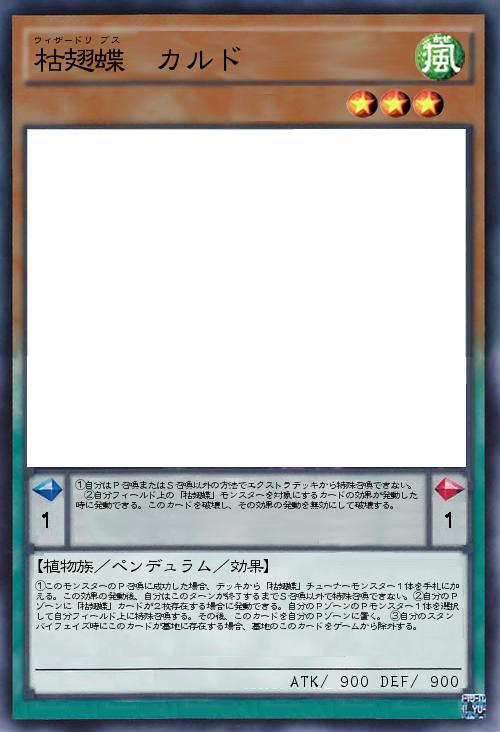 | ①このモンスターのP召喚に成功した場合、デッキから「枯翅蝶」チューナーモンスター1体を手札に加える。この効果の発動後、自分はこのターンが終了するまでS召喚以外で特殊召喚できない。②自分のPゾーンに「枯翅蝶」カードが2枚存在する場合に発動できる。自分のPゾーンのPモンスター1体を選択して自分フィールド上に特殊召喚する。その後、このカードを自分のPゾーンに置く。 ③自分のスタンバイフェイズ時にこのカードが墓地に存在する場合、墓地のこのカードをゲームから除外する。 | |||