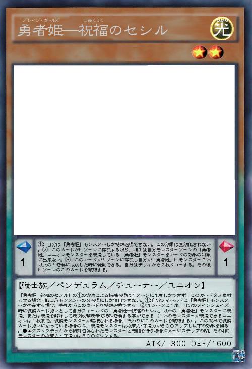| 「勇者姫―祝福のセシル」の①の方法による特殊召喚は1ターンに1度しかできず、このカードをS素材とする場合、戦士族モンスターのS召喚にしか使用できない。①:自分フィールドに「勇者姫」モンスターが存在する場合、手札からこのカードを特殊召喚できる。②:1ターンに1度、自分のメインフェイズ時に装備カード扱いとして自分フィールドの「勇者姫―祝福のセシル」以外の「勇者姫」モンスターに装備、または装備を解除して表側攻撃表示で特殊召喚する事ができる(1体のモンスターが装備できるユニオンは1枚まで。装備モンスターが破壊される場合、代わりにこのカードを破壊する)。この効果で装備カード扱いになっている場合のみ、装備モンスターは攻撃力・守備力が600アップし以下の効果を得る。●エクストラデッキから特殊召喚されたモンスターと戦闘を行う場合ダメージステップの間、その相手モンスターの攻撃力・守備力は500ダウンする。 | |||