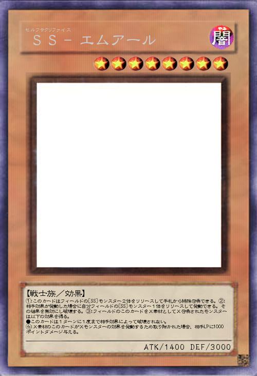 | ①:このカードはフィールドの[SS]モンスター2体をリリースして手札から特殊召喚できる。②:相手効果が発動した場合に自分フィールドの[SS]モンスター1体をリリースして発動できる。その結果を無効にし破壊する。③:フィールドのこのカードをX素材としてX召喚されたモンスターは以下の効果を得る。 ●このカードは1ターンに1度まで相手効果によって破壊されない。 ④:X素材のこのカードがXモンスターの効果を発動するため取り除かれた場合、相手LPに1000ポイントダメージ与える。 | |||
