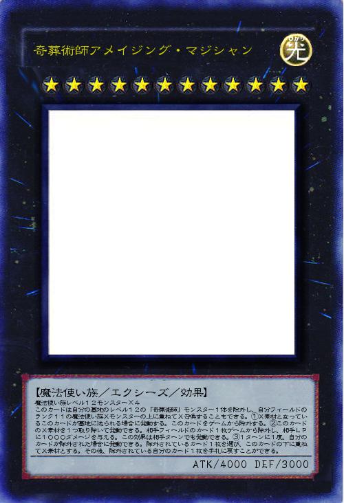 | 魔法使い族レベル12モンスター×4 このカードは自分の墓地のレベル12の「奇葬術師」モンスター1体を除外し、自分フィールドのランク11の魔法使い族Xモンスターの上に重ねてX召喚することもできる。①X素材となっているこのカードが墓地に送られる場合に発動する。このカードをゲームから除外する。②このカードのX素材を1つ取り除いて発動できる。相手フィールドのカード1枚ゲームから除外し、相手LPに1000ダメージを与える。この効果は相手ターンでも発動できる。③1ターンに1度、自分のカードが除外された場合に発動できる。除外されているカード1枚を選び、このカードの下に重ねてX素材とする。その後、除外されている自分のカード1枚を手札に戻すことができる。 | |||