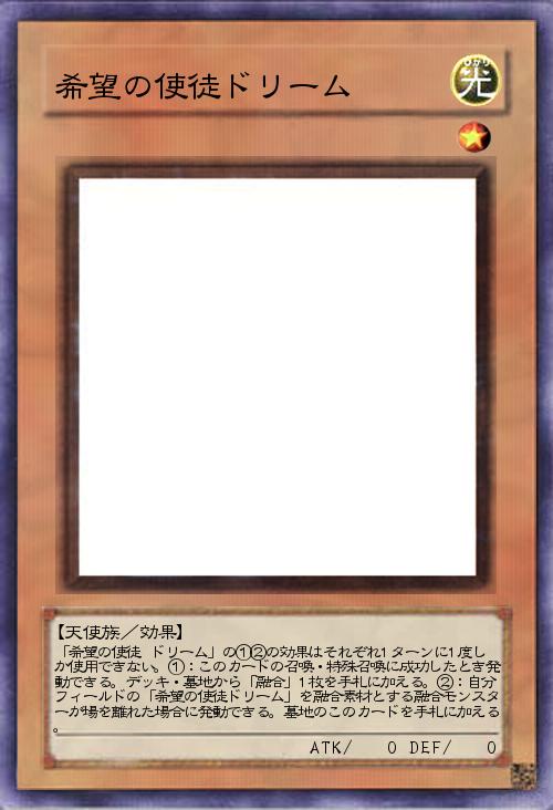 | 「希望の使徒 ドリーム」の①②の効果はそれぞれ1ターンに1度しか使用できない。①:このカードの召喚・特殊召喚に成功したとき発動できる。デッキ・墓地から「融合」1枚を手札に加える。②:自分フィールドの「希望の使徒ドリーム」を融合素材とする融合モンスターが場を離れた場合に発動できる。墓地のこのカードを手札に加える。 | |||