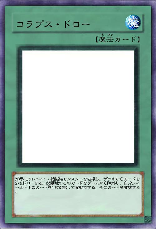 | ①手札のレベル1・機械族モンスターを破壊し、デッキからカードを2枚ドローする。②墓地のこのカードをゲームから除外し、自分フィールド上のカードを1枚選択して発動できる。そのカードを破壊する。 | |||