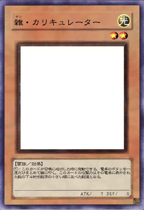 | ①:このカードが召喚に成功した時に発動できる。電卓のボタンを一度だけまとめて雑に叩く。このカードの攻撃力はその電卓に表示された数の下4桁を数字の小さい順に並べた数値となる。 | |||