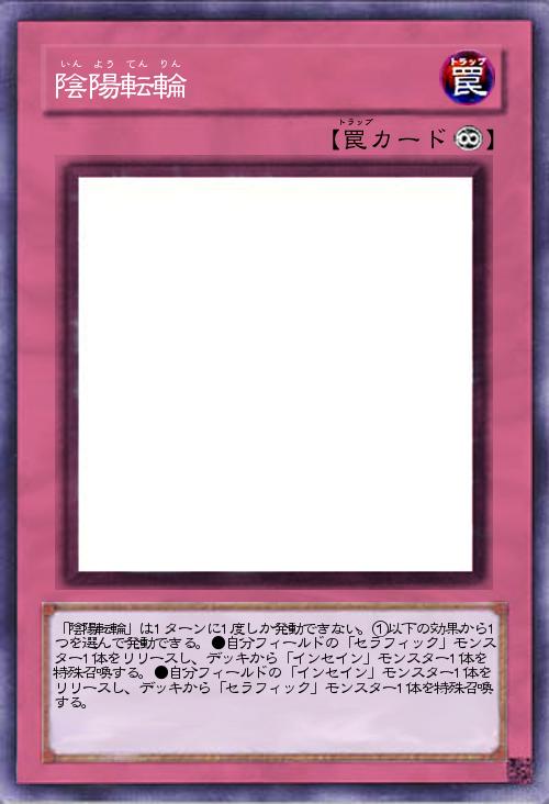 | 「陰陽転輪」は1ターンに1度しか発動できない。①以下の効果から1つを選んで発動できる。●自分フィールドの「セラフィック」モンスター1体をリリースし、デッキから「インセイン」モンスター1体を特殊召喚する。●自分フィールドの「インセイン」モンスター1体をリリースし、デッキから「セラフィック」モンスター1体を特殊召喚する。 | |||