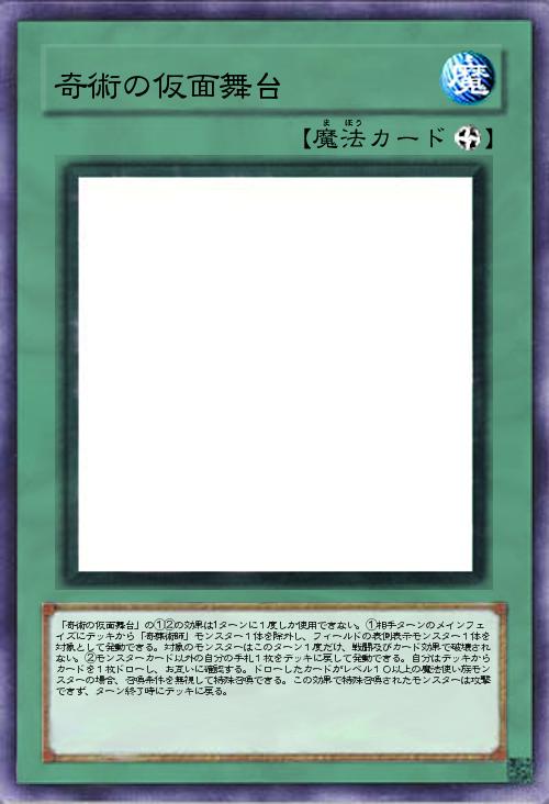 | 「奇術の仮面舞台」の①②の効果は1ターンに1度しか使用できない。①相手ターンのメインフェイズにデッキから「奇葬術師」モンスター1体を除外し、フィールドの表側表示モンスター1体を対象として発動できる。対象のモンスターはこのターン1度だけ、戦闘及びカード効果で破壊されない。②モンスターカード以外の自分の手札1枚をデッキに戻して発動できる。自分はデッキからカードを1枚ドローし、お互いに確認する。ドローしたカードがレベル10以上の魔法使い族モンスターの場合、召喚条件を無視して特殊召喚できる。この効果で特殊召喚されたモンスターは攻撃できず、ターン終了時にデッキに戻る。 | |||